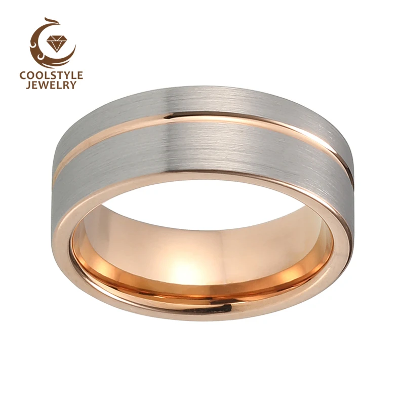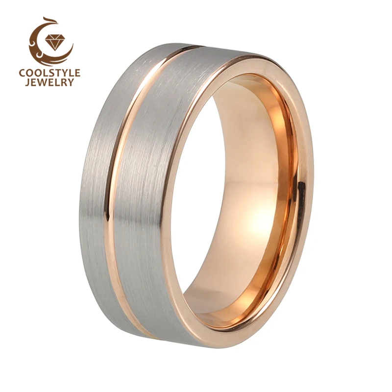 Beste Koop Coolstyle Sieraden Wolfraamcarbide Trouwring 8mm Rose Gold Offset Lijn Platte Pijp Cut Geborsteld Zilver Top Comfort Fit Goedkoop