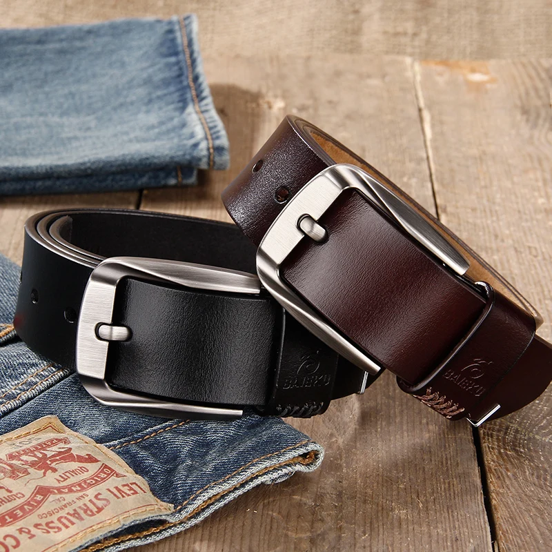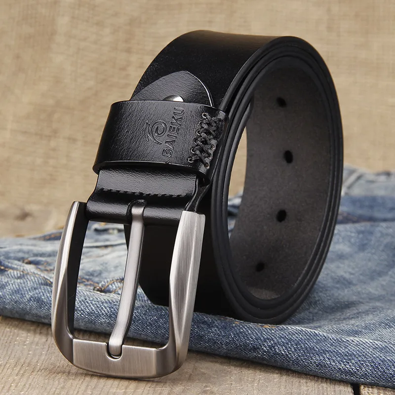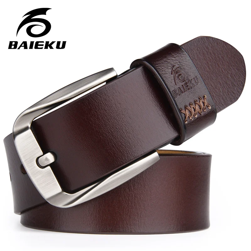 Beste Koop BAIEKU Casual stijlvolle heren riem retro lederen Hoge kwaliteit lederen taille riem voor jeans accessoires Pin gesp mannelijke riem 140 cm Goedkoop