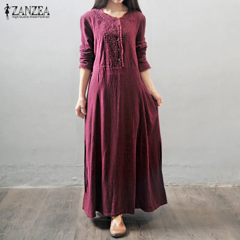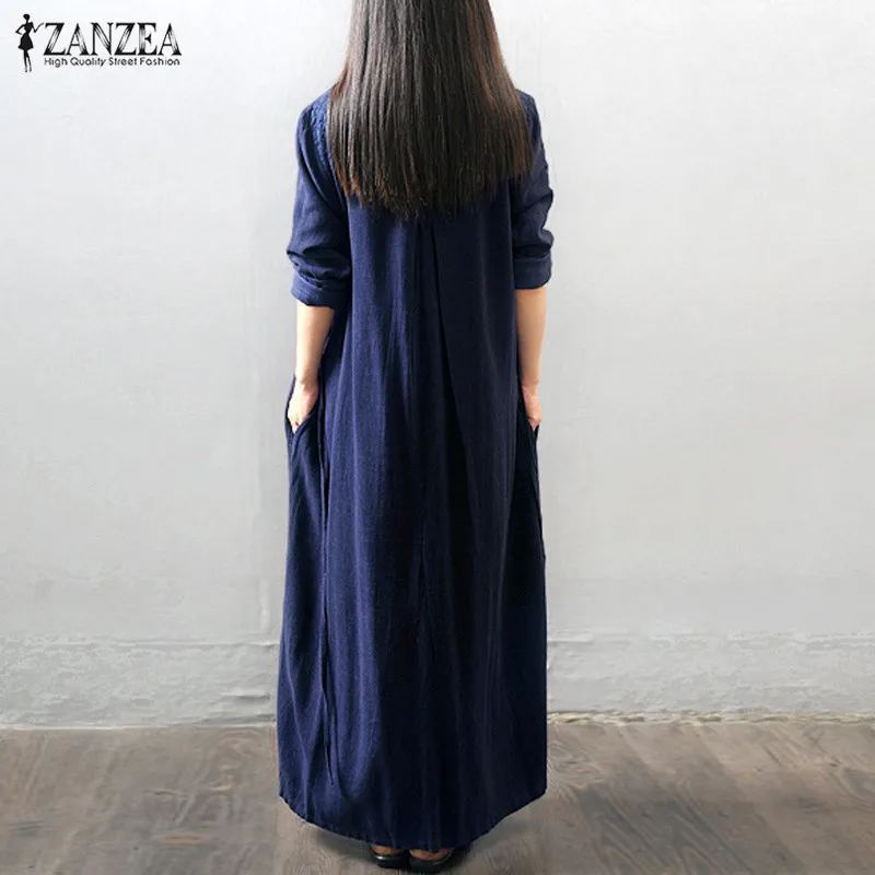 Kopen Goedkoop ZANZEA Vrouwen Lange Maxi Jurk 2016 Lange Mouw Knoppen Pockets Vintage Casual Loose Solid Lange Elegant Robe Vestidos Plus Size Prijs