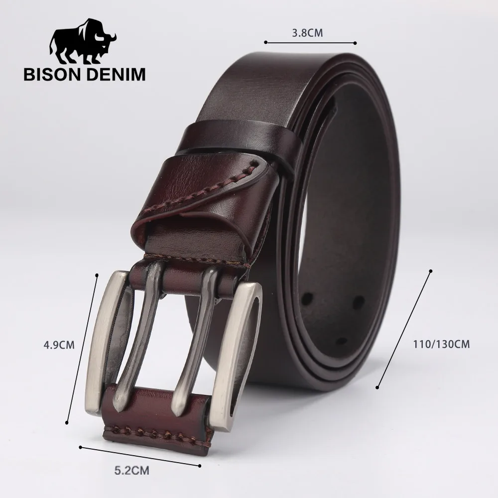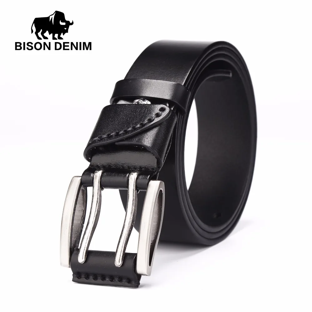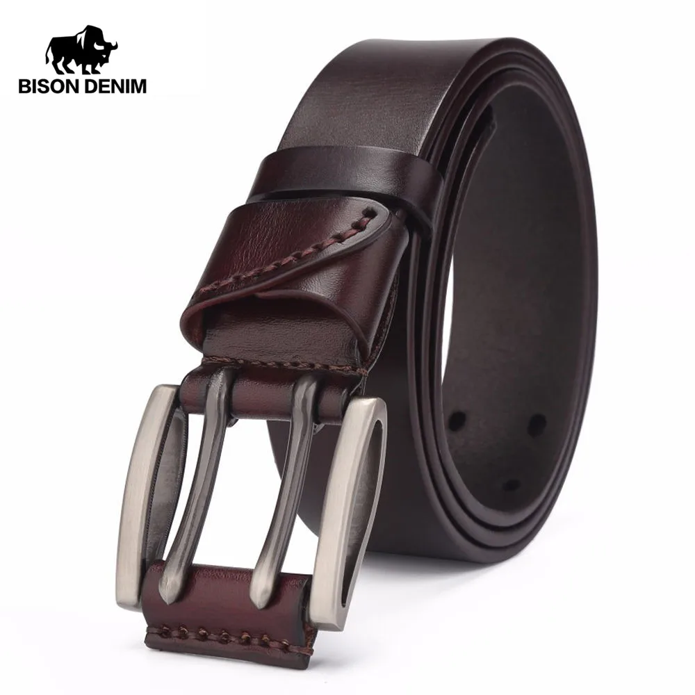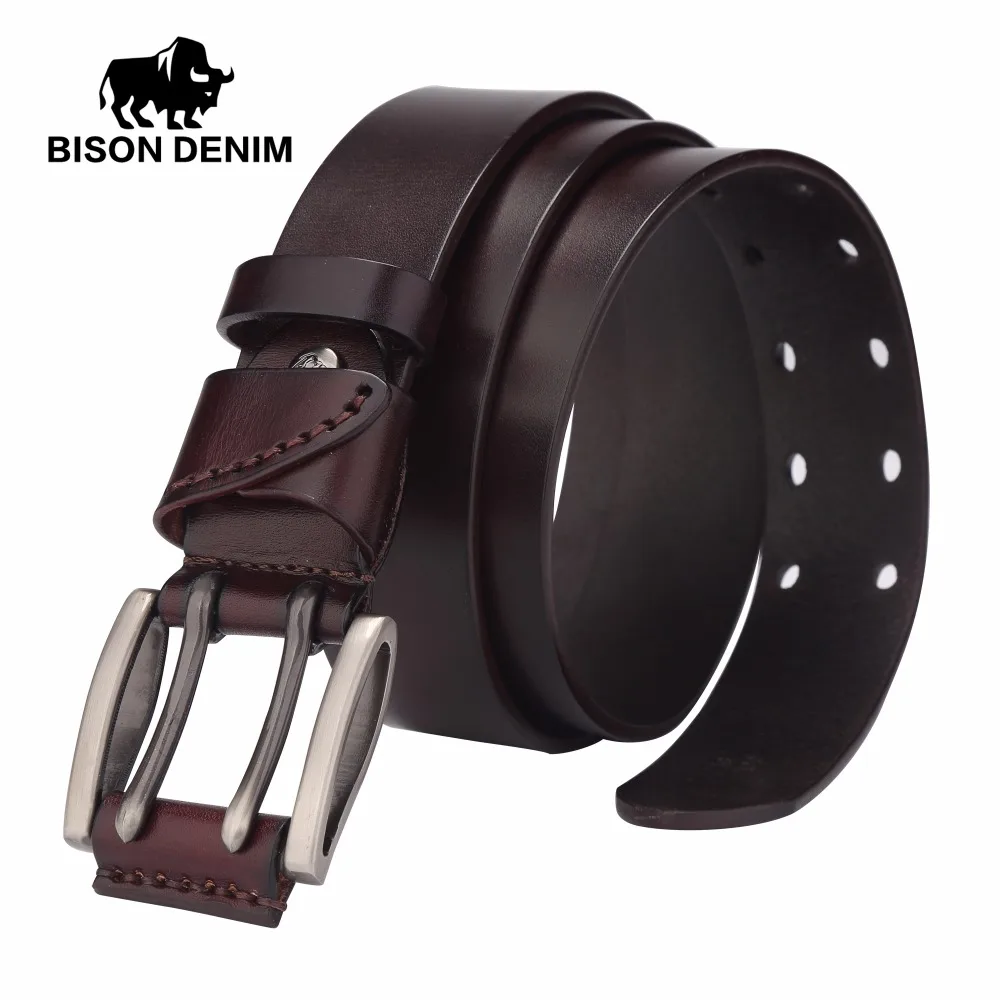Goede Koop BISON DENIM mannen Echt Lederen Riem Vintage Jeans Riem Dubbele Pin Gesp Designer Lederen Riemen Voor Mannen Mannelijke gift N7124 Goedkoop.