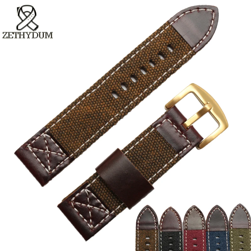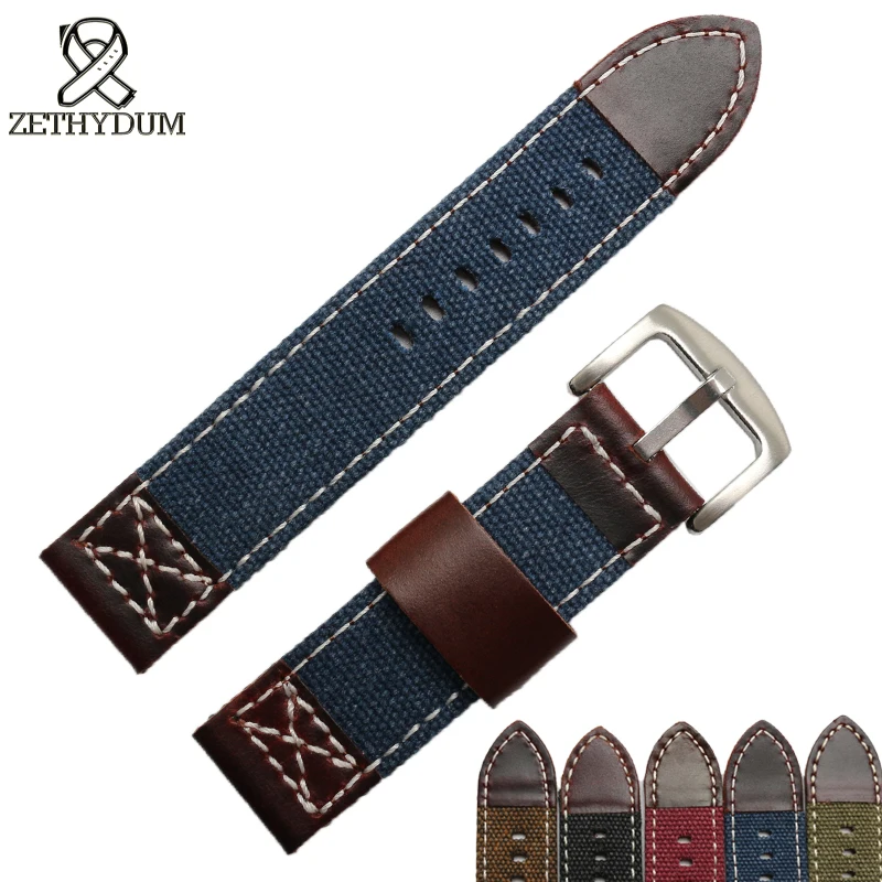 Beste Kopen Canvas nylon lederen horlogeband 20 22 24mm gestikt horloges band bodem is lederen horlogebandje pin gesp Goedkoop